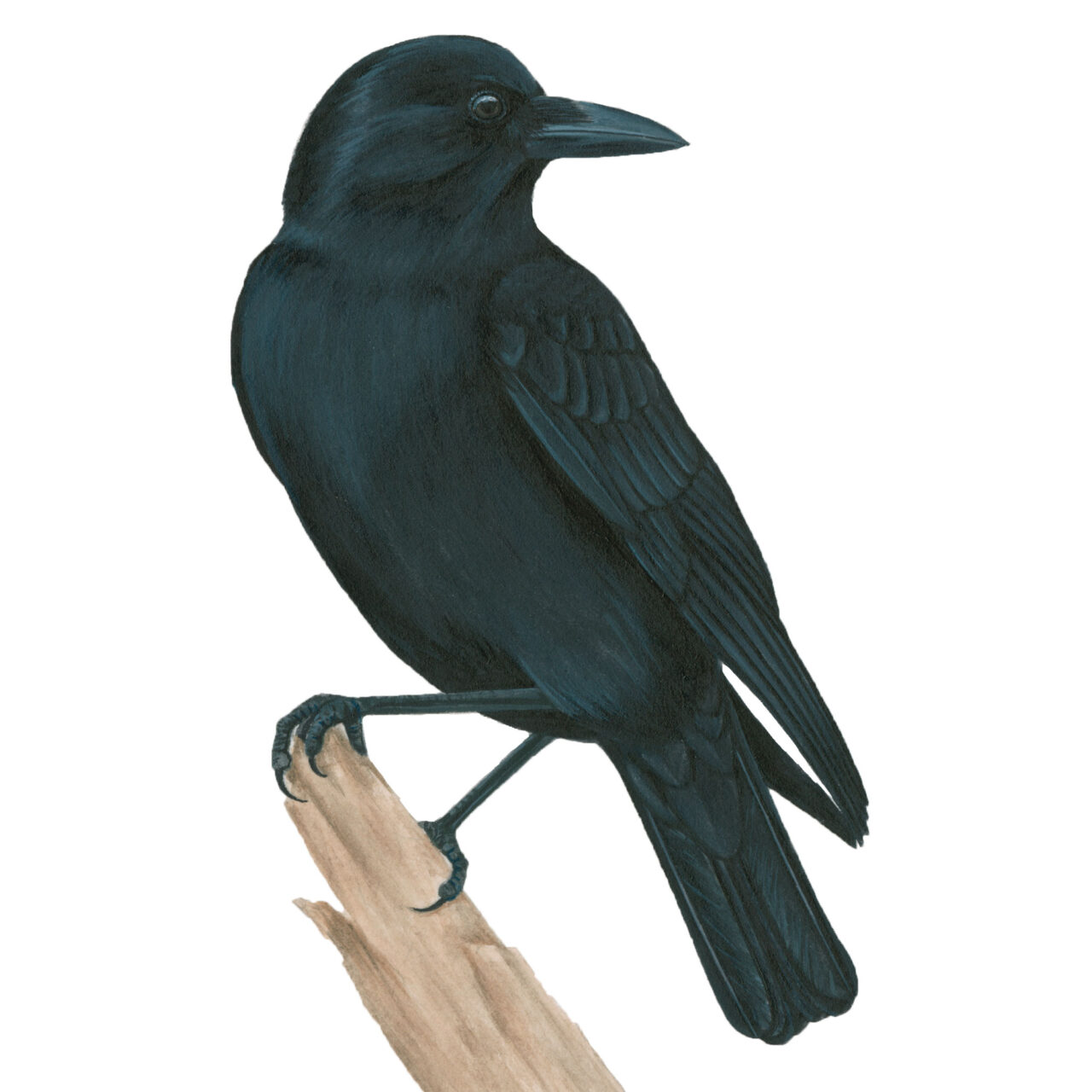 The American Crow is nearly identical to both Northwestern and Fish crows. To distinguish Fish Crows, check range maps and listen for the Fish Crow’s more nasal calls. Northwestern Crows occur only along the Pacific Northwest coast; they are slightly smaller and best separated by habitat. Common Ravens are larger, longer winged, and heavier beaked than crows. Ravens’ tails are tapered at the end, giving them a diamond or wedge shape compared to a crow’s shorter, squarer tail.