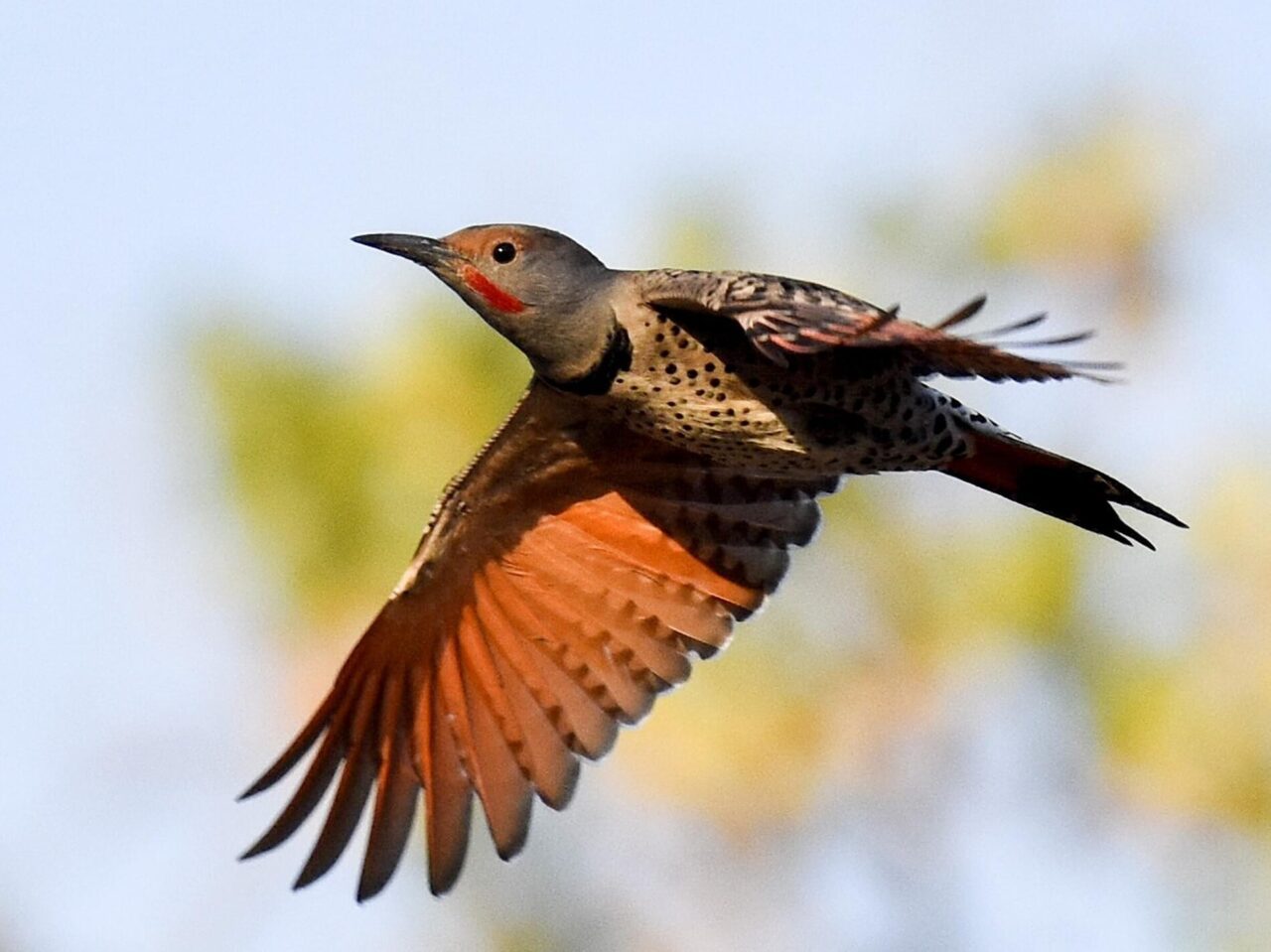 Flickers appear brownish overall with a white rump patch that’s conspicuous in flight and often visible when perched. The undersides of the wing and tail feathers are bright yellow, for eastern birds, or red, in western birds. With a closer look you’ll see the brown plumage is richly patterned with black spots, bars, and crescents.