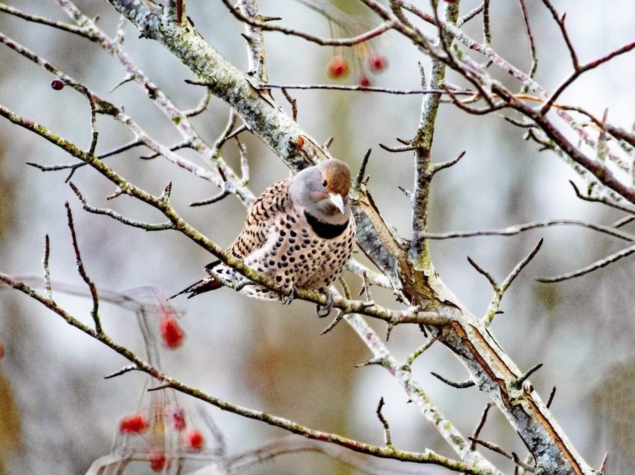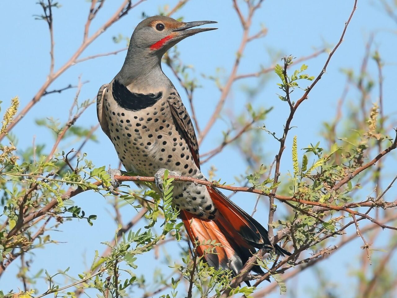 Northern Flickers don’t act like typical woodpeckers. They mainly forage on the ground, sometimes among sparrows and blackbirds. When flushed, flickers often perch erect on thin horizontal branches rather than hitching up or around a tree trunk. Flickers do fly Iike most woodpeckers do, rising and falling smoothly as they intersperse periods of flapping with gliding. Early in spring and summer, rivals may face off in a display sometimes called a “fencing duel,” while a prospective mate looks on. Two birds face each other on a branch, bills pointed upward, and bob their heads in time while drawing a loop or figure-eight pattern in the air, often giving rhythmic wicka calls at the same time.