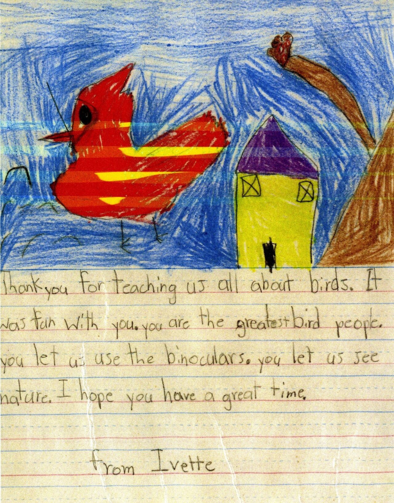 Once a month, George and Les, affectionately known as ‘the bird people’, would visit both schools and go on observation walks with students, recording what CUBs focal species they saw and teaching the kids about the ‘Bird of the Month’. Using the Cornell Lab of Ornithology’s coloring book, students explored the features of common birds in their area, and they also learned about important habitat needs for urban birds. As you can see from photos of the bird-watchers and some of the letters that students from the Pleasantville schools sent to ‘the bird people’, participants in the after-school program really enjoyed learning about birds, and especially using binoculars!