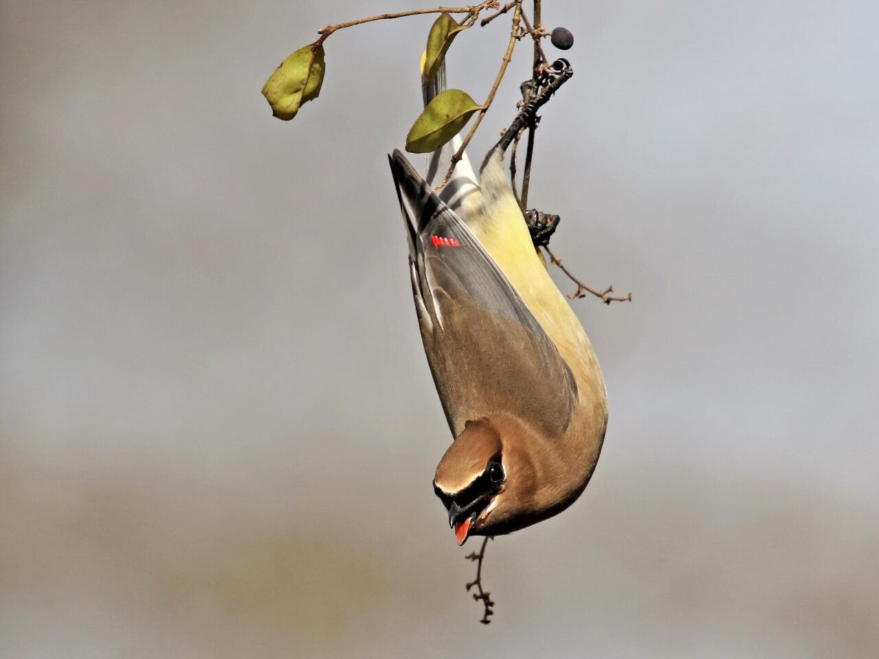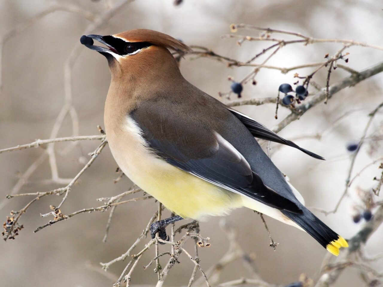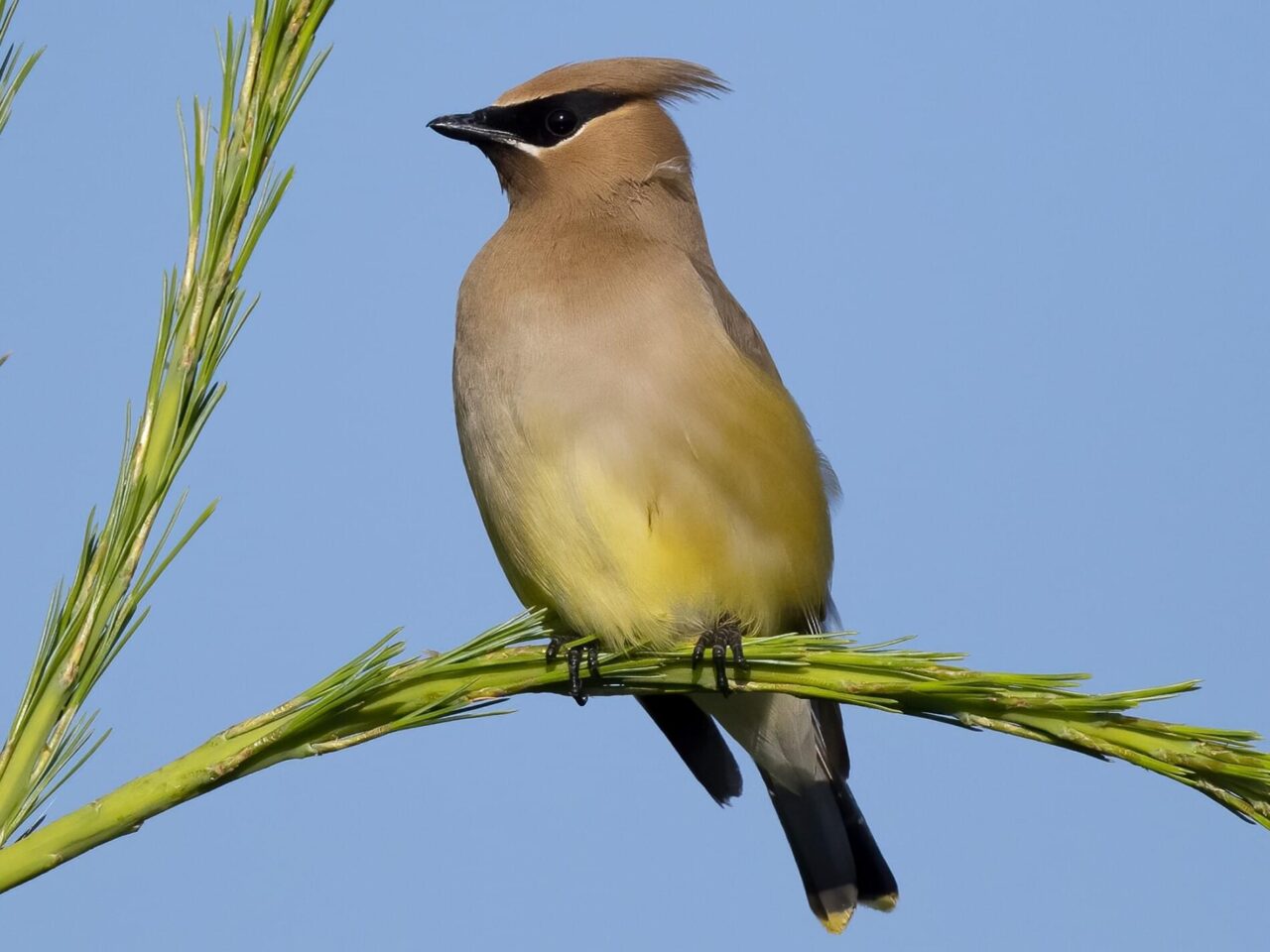 Cedar Waxwings are pale brown on the head and chest fading to soft gray on the wings. The belly is pale yellow, and the tail is gray with a bright yellow tip. The face has a narrow black mask neatly outlined in white. The red waxy tips to the wing feathers are not always easy to see.