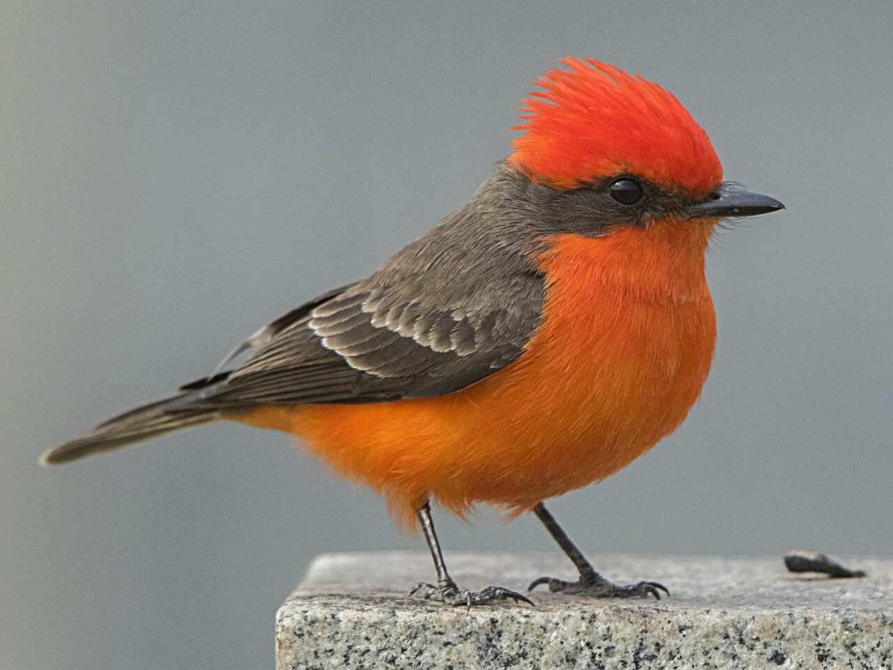 - Twelve subspecies of Vermilion Flycatcher are recognized, including a race with a dark morph that ranges from western Peru to northern Chile. Both male and female of this morph are dark all over, with some males having a few red feathers on the head, and some females having a pinkish wash under the tail. About half of the Vermilion Flycatchers in Lima, Peru are the dark morph, but the proportion decreases as one goes further southward.