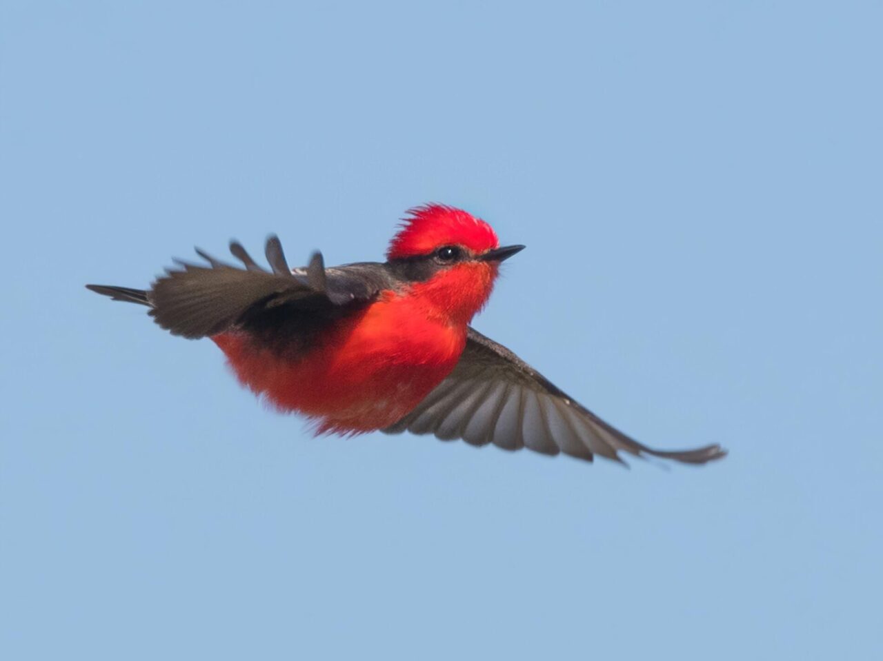 Males aggressively guard their territory from other Vermilion Flycatchers as well as other birds using a warning posture with tail and crest erect. While on territory, males perform an elaborate flight display to attract females in which they rise 60–100 feet above surrounding vegetation, alternately gliding and flapping with shallow wingbeats while singing a twittering flight song. If interested, the female then joins the male as they inspect potential nest sites, often with the male bringing insects to the female. Pairs are socially monogamous, though mating outside the pair (extra-pair copulation) is not uncommon. The female incubates the eggs while the male brings food, and both parents feed the chicks. When not breeding, Vermilion Flycatchers are typically solitary birds, though small flocks of males may form in the winter.