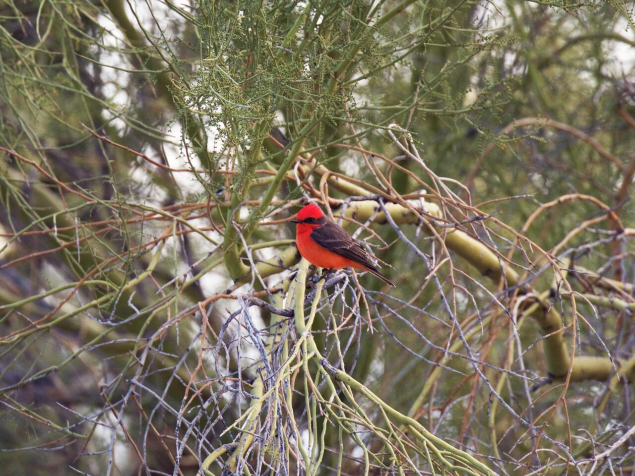 In all seasons, the Vermilion Flycatcher can be found in any open country in the American Southwest, including arid scrublands, farmlands, deserts, parks, and canyon mouths. They are especially reliant on stream corridors within the scrub ecosystem, in areas where willow, sycamore, cottonwood, mesquite, and other bottomland trees grow. South of the U.S. they occur in similar open, shrubby country in tropical lowlands and to as high as 10,000 feet elevation.