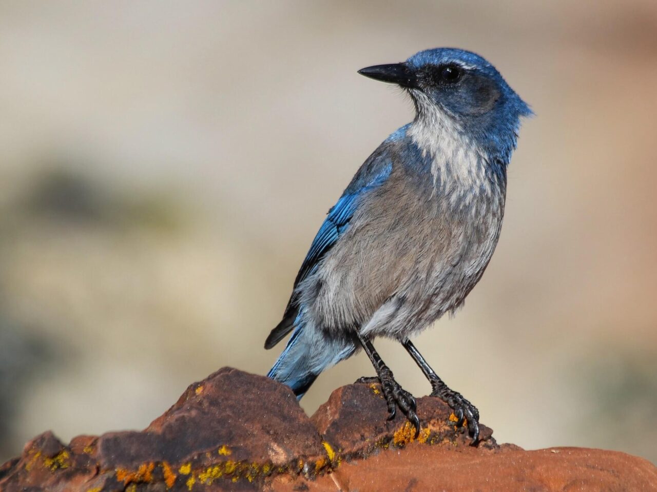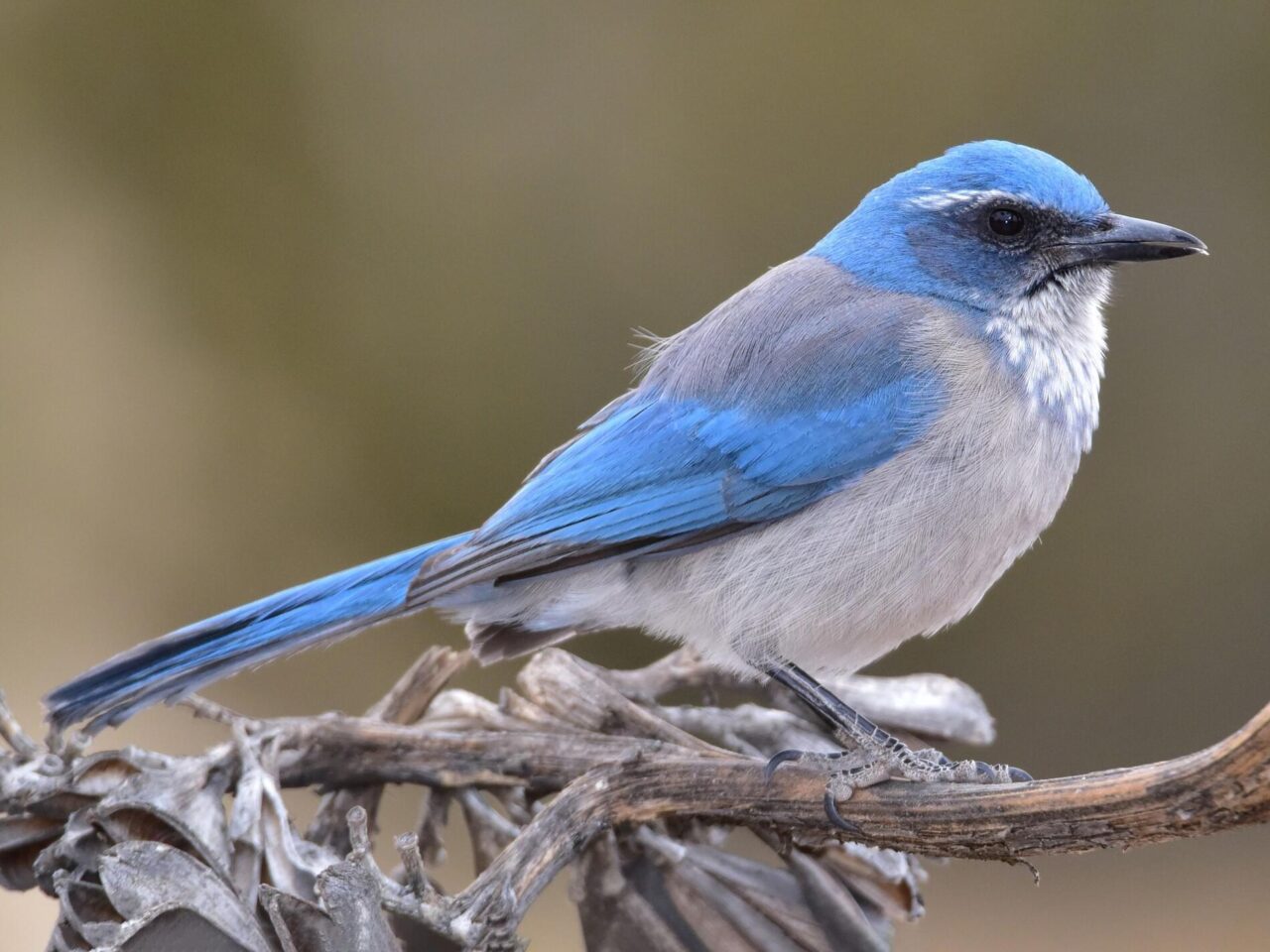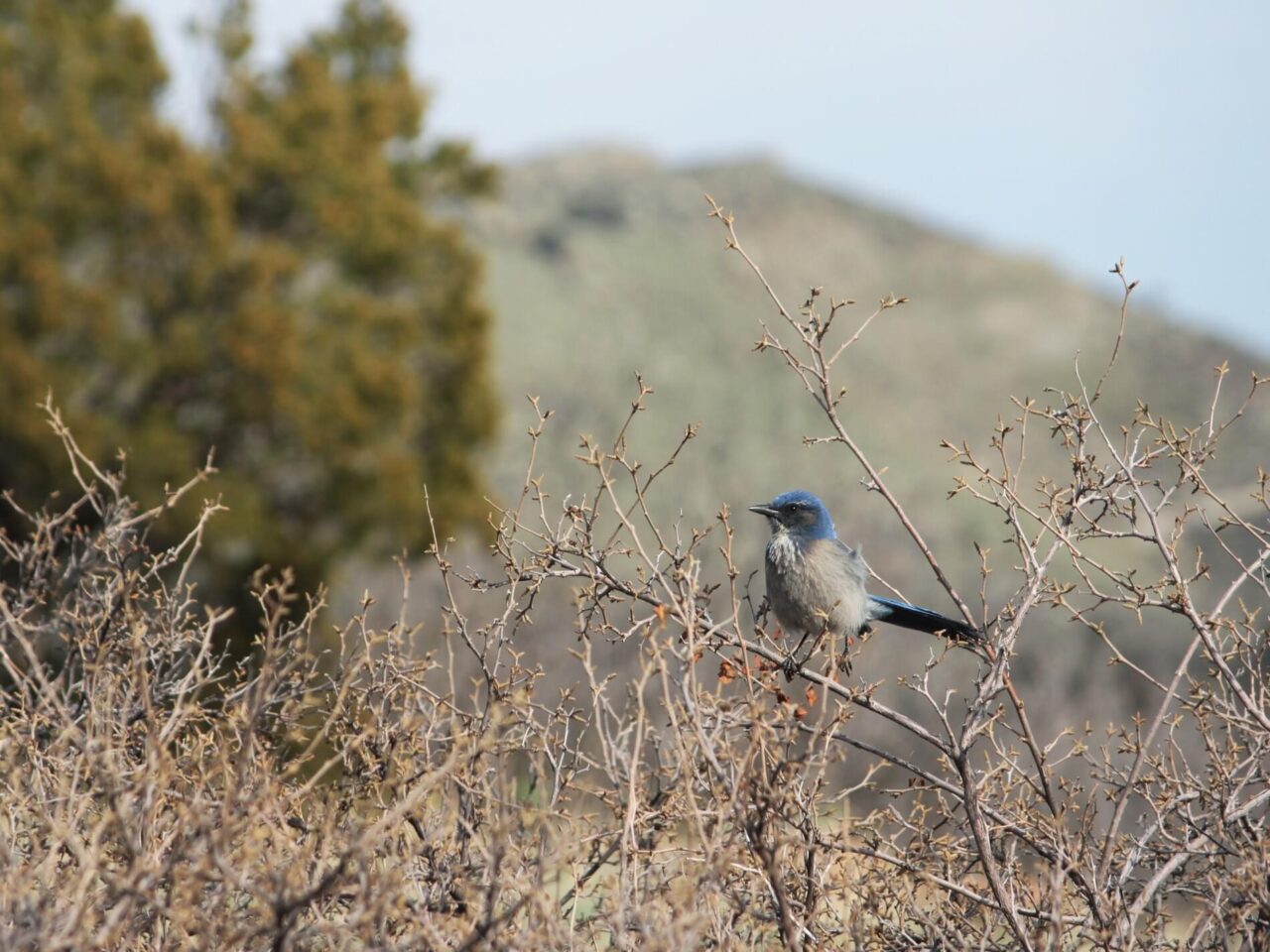 The “blue jay” of dry lowlands from Nevada south to Mexico, Woodhouse’s Scrub-Jay is a dusty blue bird set off by gray-brown and white. It looks very similar to the California Scrub-Jay (they were considered the same species until 2016), but it’s a dimmer blue and dingier gray, with almost no necklace, a straighter bill, and higher-pitched calls. The bird’s rounded, crestless head immediately sets it apart from Blue Jays and Steller’s Jays. These birds are a fixture of dry shrublands and woodlands of pinyon pine and juniper.