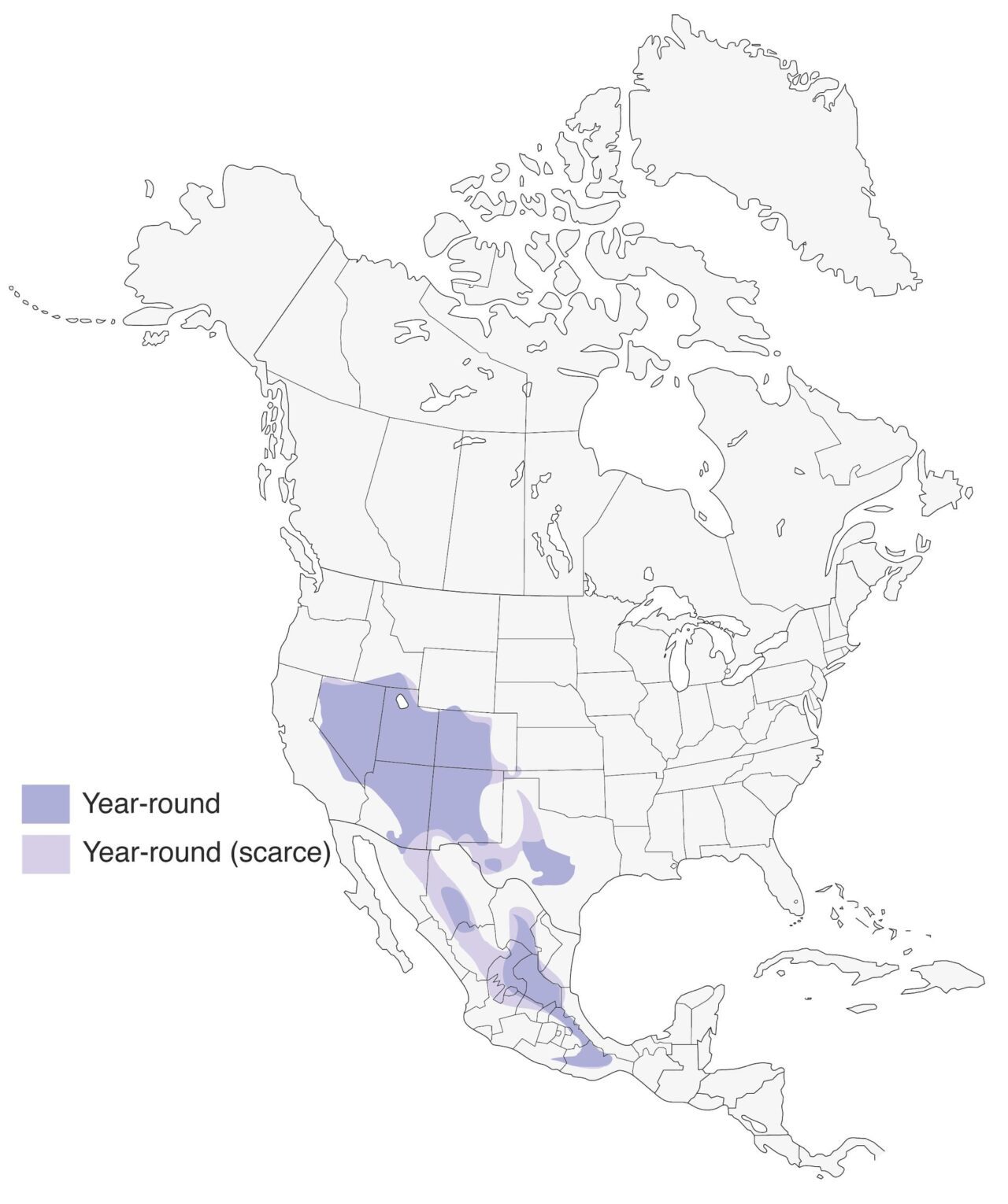 Woodhouse’s Scrub-Jays live primarily in pinyon-juniper and oak-pinyon forests of the interior western United States. Less often, you may find them in stands of mountain mahogany, juniper stands, among trees and cactus along desert streams, or in the oak scrublands of Texas’s Edwards Plateau. In Mexico they also live in palmetto and thorn scrub in Oaxaca and in pine-spruce forests at high elevations in the Sierra San Pedro Mártir. They also live around people and may appear in suburbs, golf courses, and parks.
