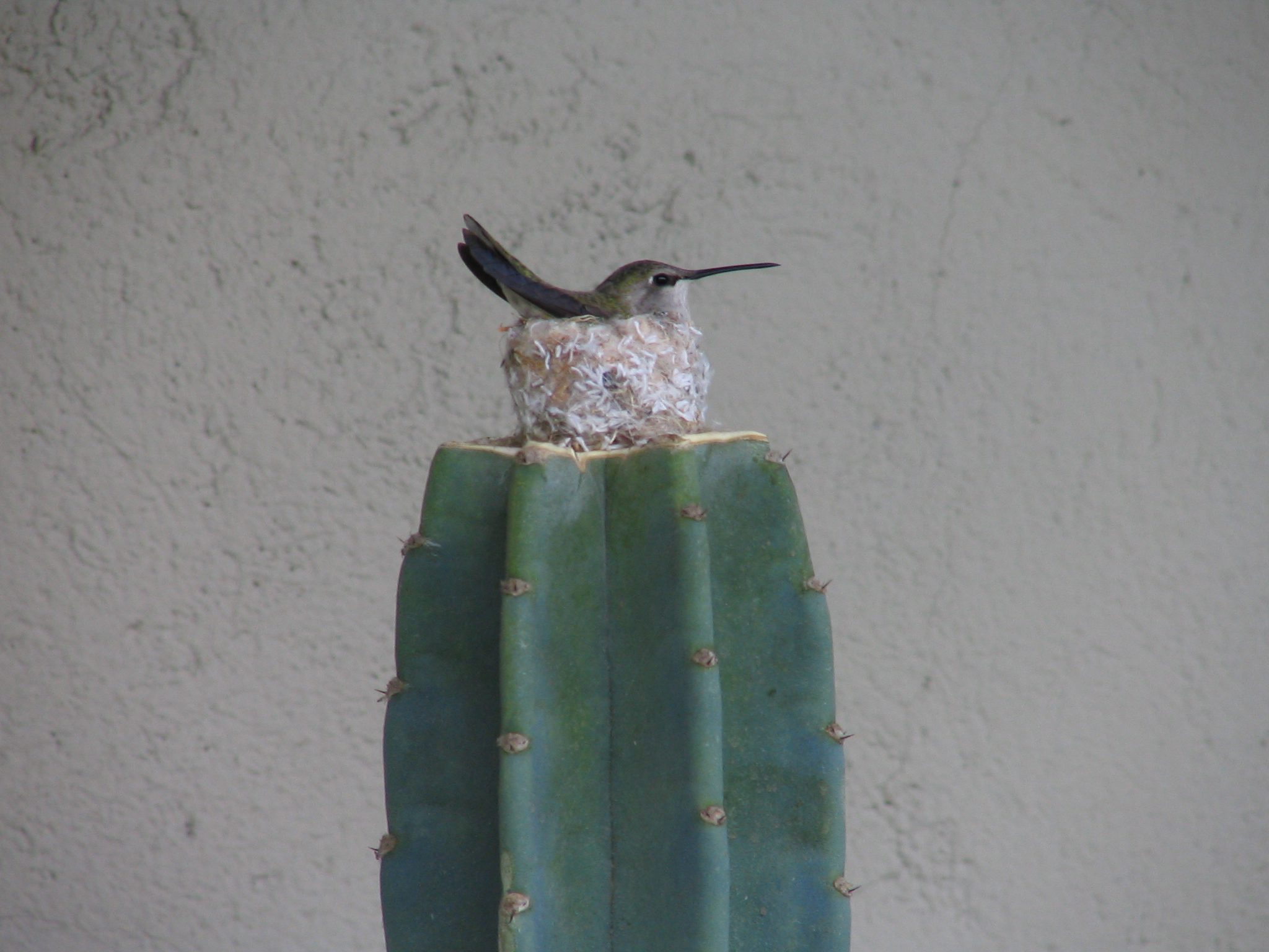 this photo of a hummingbird nesting on top of a cactus in the yard of the