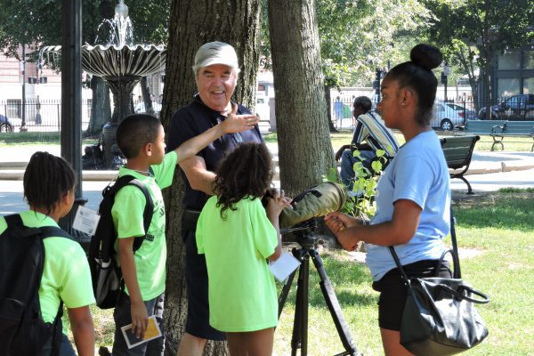 At the second station, the kids were able to put their newly learned identification skills to use! With the help of expert birders Jackson Mersick and Ursula and David Goodine, the children observed some birds through binoculars at the Blackstone Square and Franklin Square Parks!