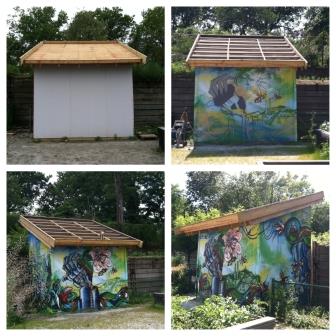 As part of the habitat improvements and the arts, and with the help of Lawrence Youth Build (an organization dedicated to revitalizing low-income communities through youth members) the group reconstructed the community garden shed with a green roof. The shed was painted by Alex Brian, cofounder and art director of the non-profit Elevated Thought Foundation, with a mural that displays the beauty of urban nature emerging an industrial city. Kids from Lawrence’s Boys and Girls Club were able to go out with Alex and got the chance to learn about some of the basics of mural composition and design; they even learned to write their names with spray cans!
