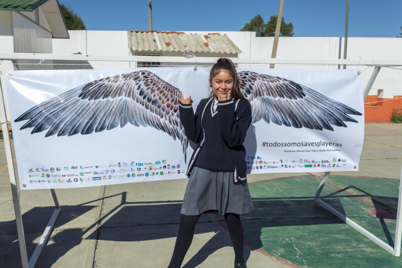 The Inalafquen Foundation, a member of the Argentine Council of the Hemisférica de Reservas para Aves Playeras Network (Western Hemisphere Shorebird Reserve Network) shared a fabric hanging of a giant pair of wings with the hashtag #TodosSomosAvesPlayeras (#Weareallshorebirds). The young people had their photographs taken in front of this wall hanging. Attendees also admired the drawings made by the students. The images were full of color and showed the natural beauty of the birds of the region.