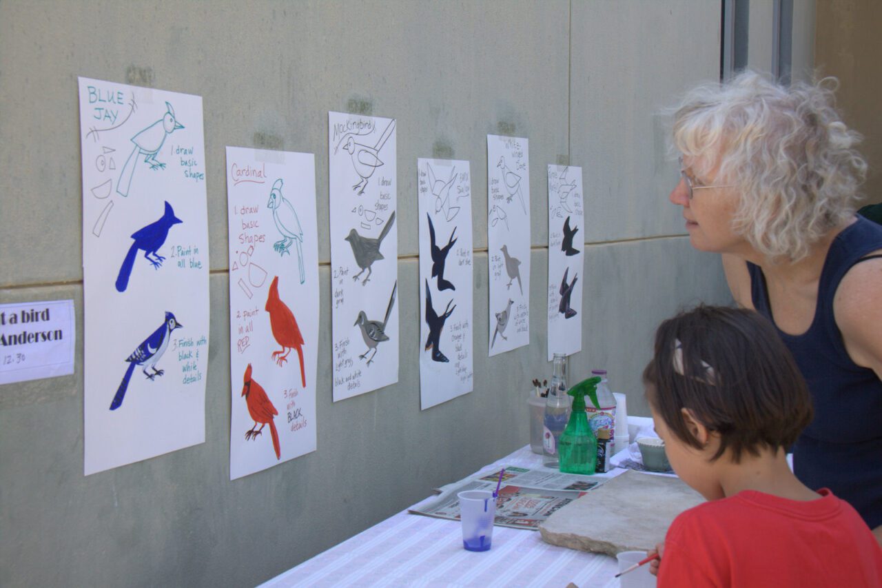 - Pintar pájaros sobre rocas con Linda Anderson (se colocaron rocas alrededor del jardín de aves).