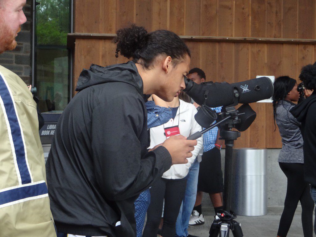 El personal del Proyecto NestWatch guió a los estudiantes a un paseo por el Santuario Natural Sapsucker Woods en busca de nidos de aves. Aprendieron sobre la biología reproductiva y el hábitat. Los jóvenes usaron telescopios y binoculares para observar de cerca las especies locales. También conocieron YardMap y aprendieron sobre la creación de hábitats y las aplicaciones tecnológicas en la conservación.
