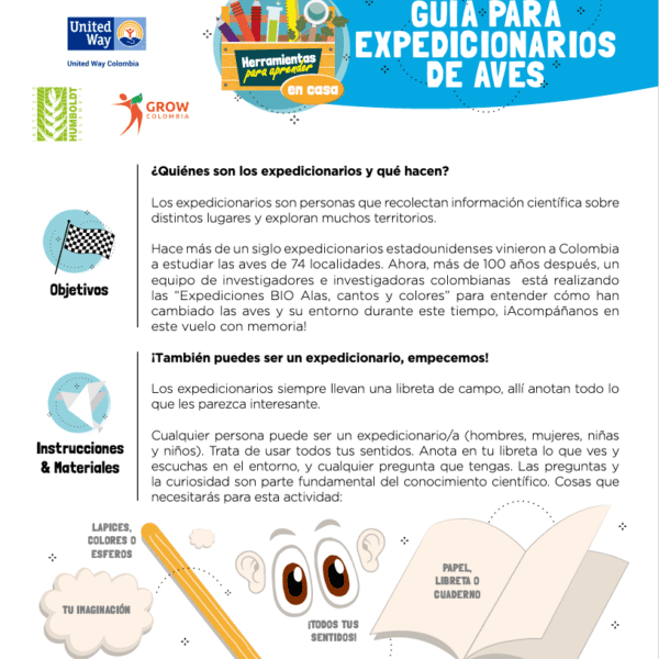 Esta entretenida guía de actividades fue creada para que niños y jóvenes se inspiren y salgan a explorar y aprender más acerca de aves y cómo observarlas en detalle mientras descubren la alegría de estar en contacto con la naturaleza. Cualquier persona puede participar en una expedición de aves para expandir su conocimiento y aprecio por las aves de su comunidad. Todo lo que se necesita es curiosidad, la guía de actividades y lápices para descubrir el maravilloso mundo de las aves y la naturaleza. ¡Es así de fácil!