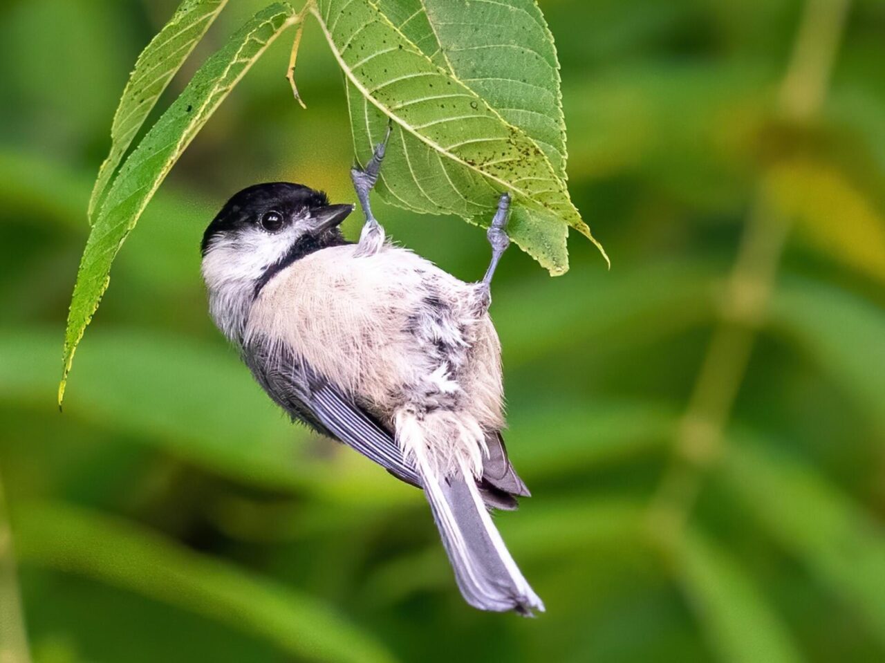 Carolina Chickadees have a black cap and bib separated by stark white cheeks. The back, wings, and tail are soft gray.
